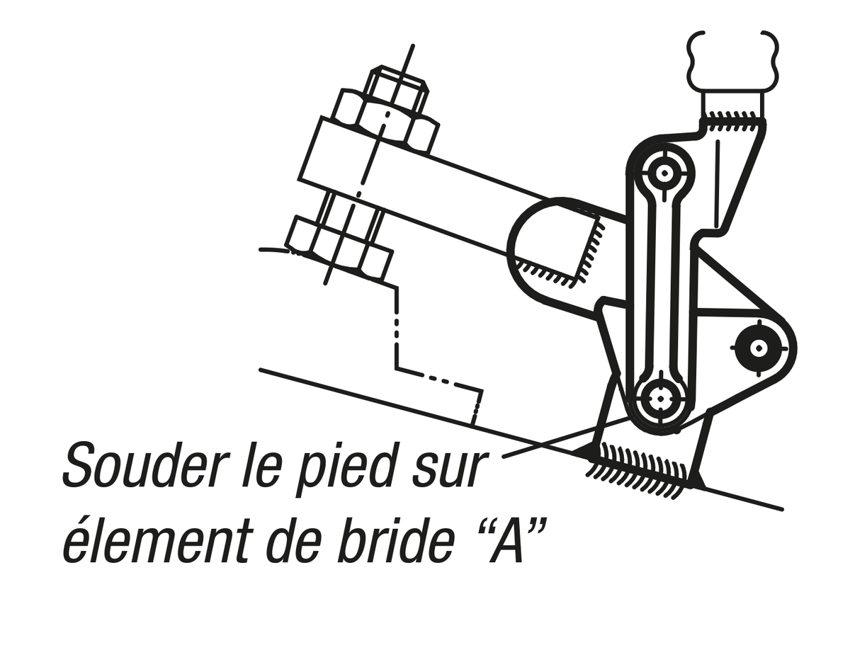 Lubrifier fréquemment les axes. Eviter les projections de soudure dans les articulations lors de l’assemblage des composants (levier, bras).  Il est possible de monter la sauterelle sans l’embase médiane, directement sur un support de votre fabrication. Pour cela, dévisser l’axe D2, retirer l’embase et remonter la sauterelle sur le support qui aura été percé à D2. Ne pas oublier de souder les flasques A sur le nouveau support.