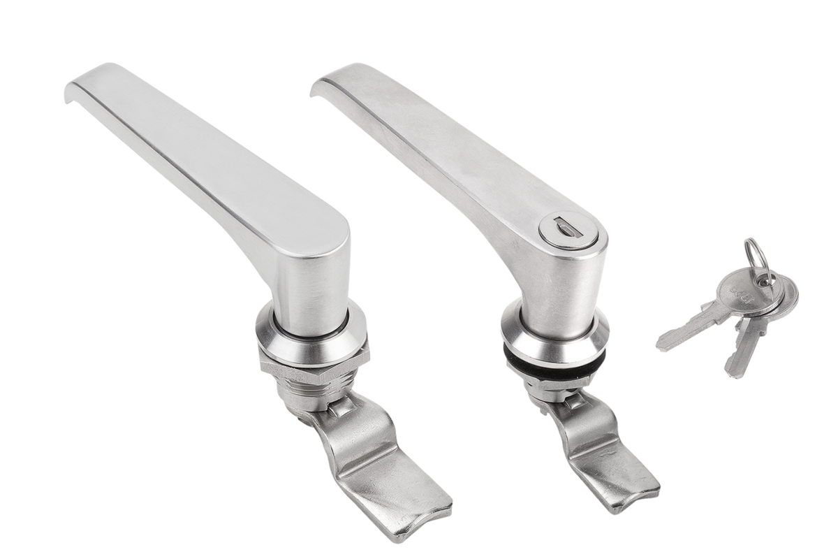 Verrou quart de tour avec poignée en L. Montage possible à droite ou à gauche avec course de fermeture de 90°. Le verrou quart de tour peut être prémonté. Indice de protection IP65.