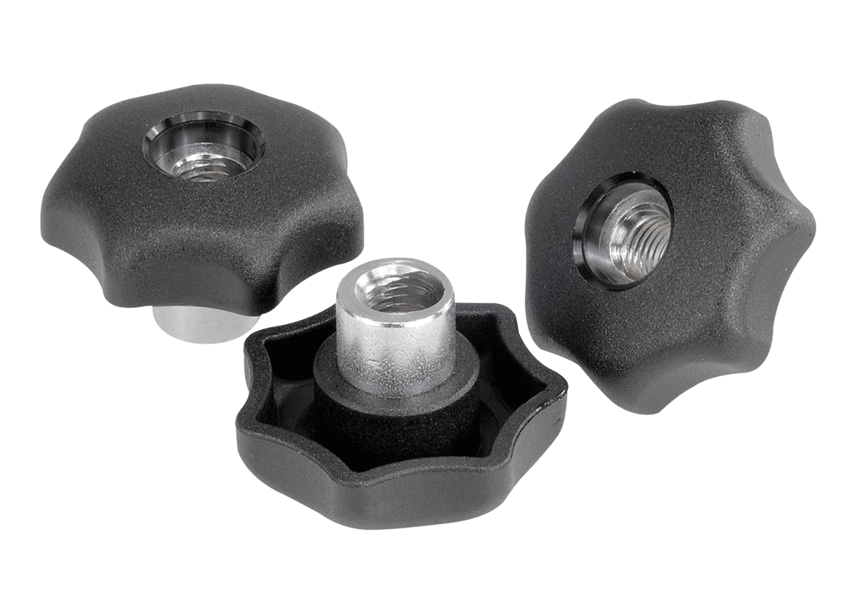 Les boutons étoile à serrage rapide s’utilisent sur tous les dispositifs qui se contentent d’efforts de serrage faibles. Fonctionnement grâce à un demi-filetage.