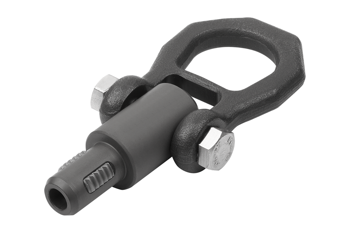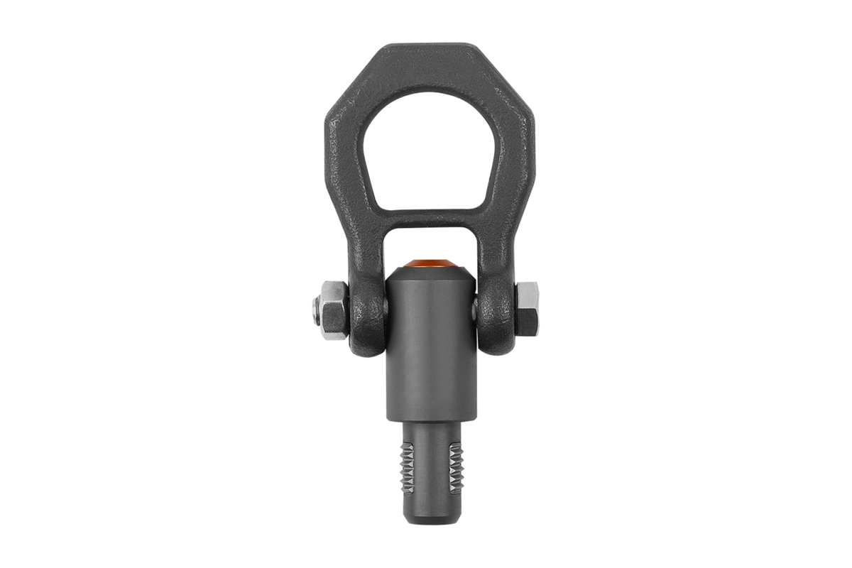 Un appui sur le bouton-pression permet de déverrouiller les segments filetés et d’insérer le boulon de support fileté dans le taraudage ou de l’en retirer. Lorsque le bouton-pression est relâché, les segments filetés se verrouillent en toute sécurité. Le vissage et le dévissage, chronophages, ne sont donc plus nécessaires, comme c’est par ex. le cas avec un anneau de levage.