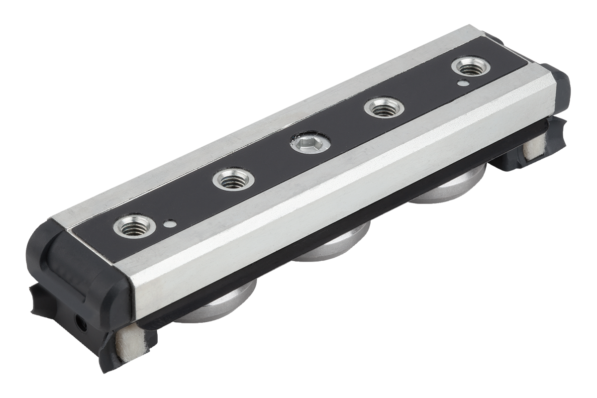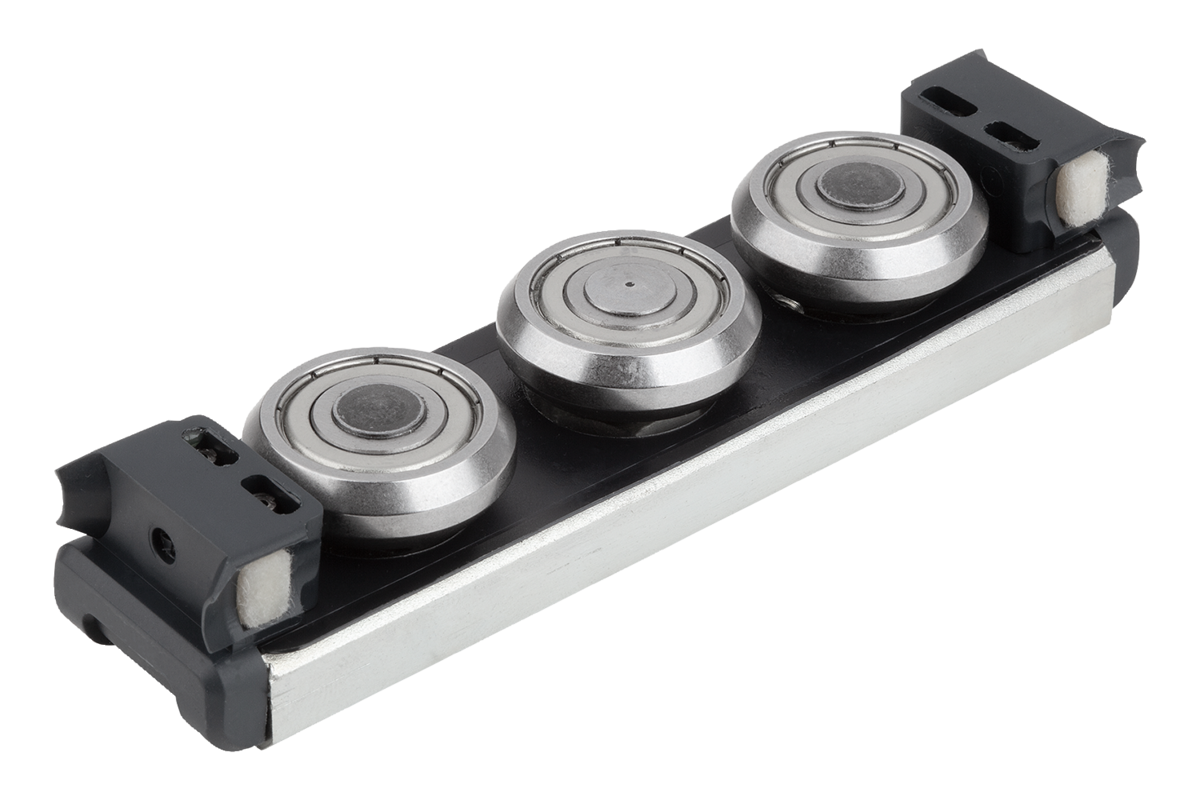 Chariots de guidage à rouleaux avec paliers à rouleaux à lubrification permanente et racleurs assurant la lubrification du système pendant le déplacement.