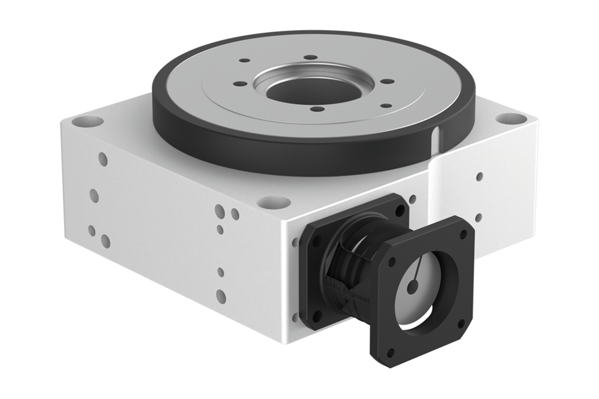 Tables de positionnement rotatives pour opérations de déplacement et de positionnement motorisées. Le réducteur à vis sans fin précontraint fonctionne quasiment sans jeu. Le palier fixe des tables rotatives motorisées est conçu comme un roulement à rouleaux croisés. Ce palier peut supporter des couples de basculement et des forces transversales extrêmement élevés. Le grand trou dans l’arbre creux permet de faire passer des conduites. La bague de positionnement réglable permet de définir librement le point de référence de rotation par rapport à la position du composant monté. Possibilité de monter des détecteurs de proximité avec le support de capteur (21085-02-901) disponible en option. Nous proposons le logiciel de programmation correspondant au moteur pas à pas avec commande de positionnement en téléchargement.