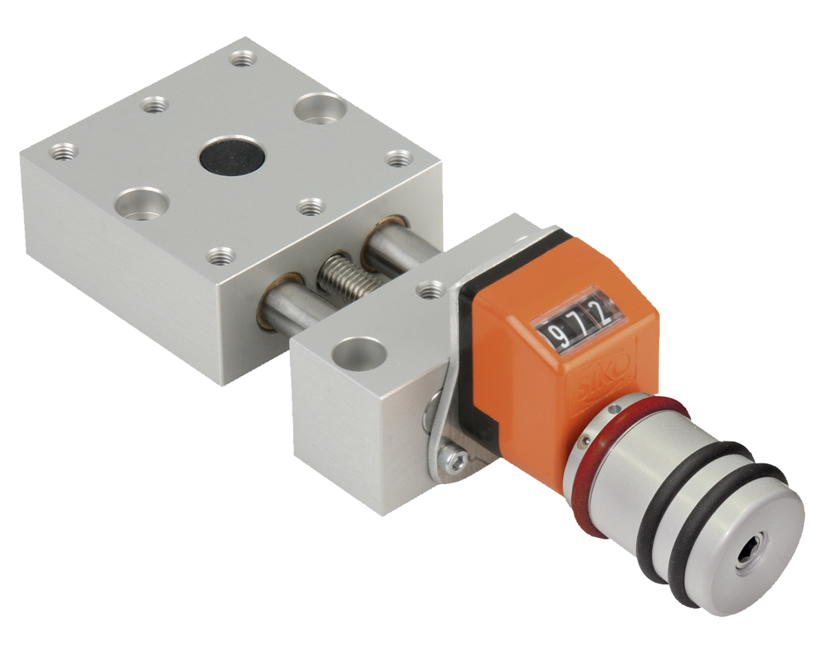 Indicateur de position numérique avec une précision d‘affichage de 0,1 mm, chiffres dans l‘ordre croissant et rotation dans le sens des aiguilles d‘une montre. La valeur d‘affichage peut être réglée en tournant la bague d'entrainement rouge sans l'aide d'outil. La position de montage de l‘indicateur de position peut être fixée au moyen d‘une vis dans 4 positions.