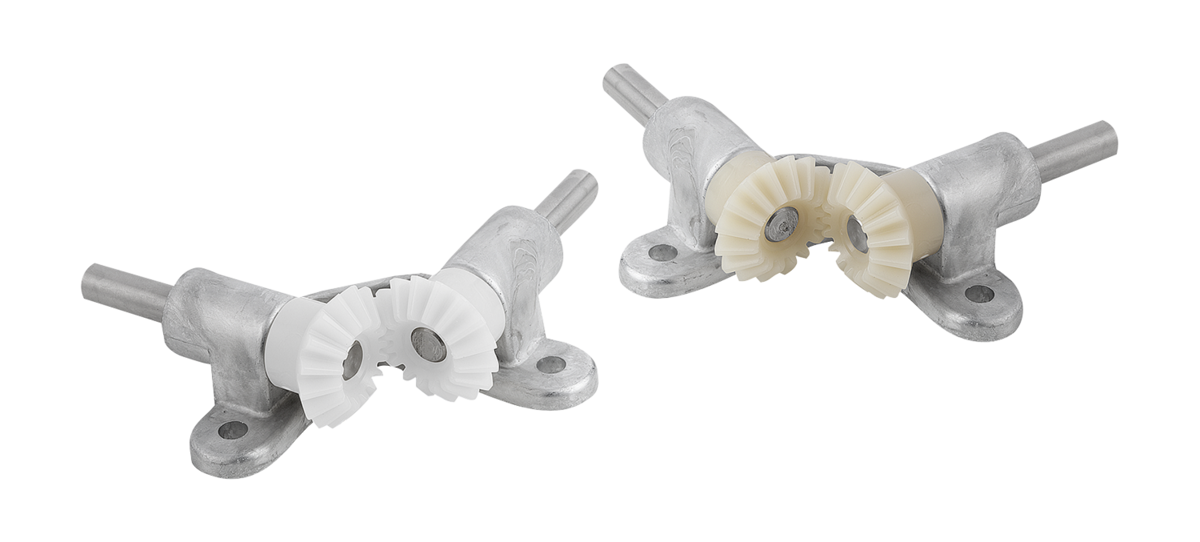 Réducteur à roue universel sans entretien en six dimensions différentes avec rapport 1:1. Le sens de rotation est indifférent. Les arbres sont montés dans le corps sur un palier lisse autolubrifiant. L'angle axial est de 90°.