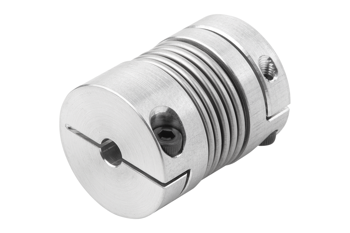 Accouplements miniatures à soufflet métallique sans jeu avec grande résistance à la torsion. Le soufflet métallique permet de compenser le désalignement axial, radial et angulaire de l'arbre en cas de forces de rappel faibles. Avec moyeux de serrage pour la fixation de l'arbre.