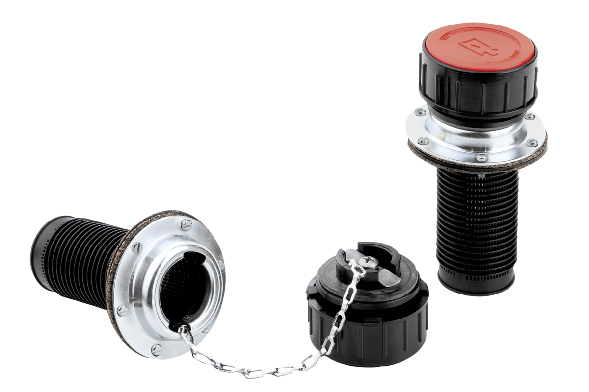 Forme B : Comprend une soupape d'aération et de purge en plastique. La pression d’ouverture lors de la purge est de 0,35 bar (±0,05 bar). La pression d’ouverture lors de l'aération est de 0,05 bar. Cette forme convient donc pour les applications où le flux d'air est bidirectionnel.