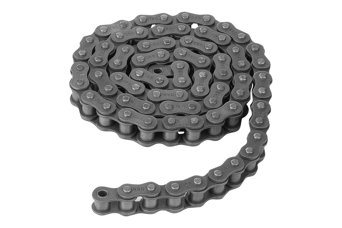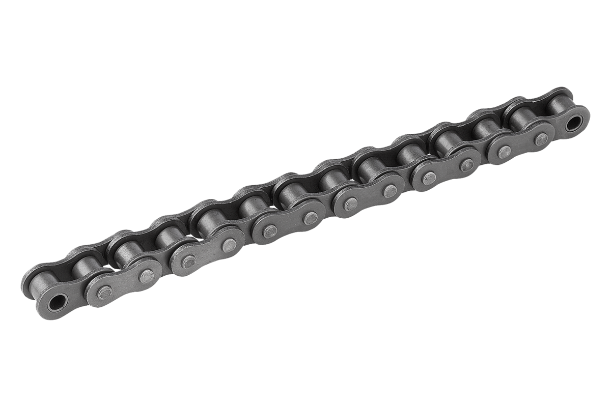 Chaînes à rouleaux de type européen conformément à la norme DIN ISO 606 avec plaques arrondies (ISO N° 06 à plaques droites). Toutes les chaînes sont pré-étirées.