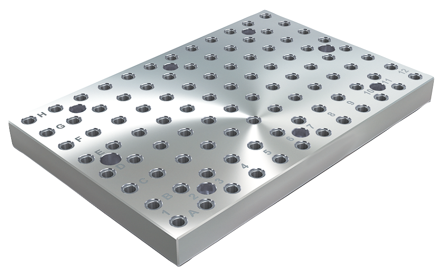 Les plaques de base avec trame modulaire sont utilisées pour la configuration de dispositifs modulaires. Ces plaques de base sont positionnées et fixées directement sur les tables de machine-outils.