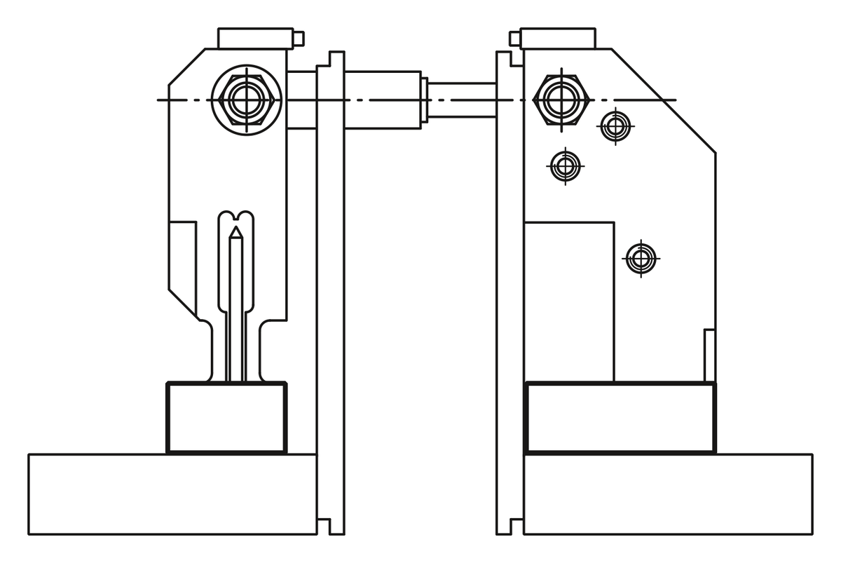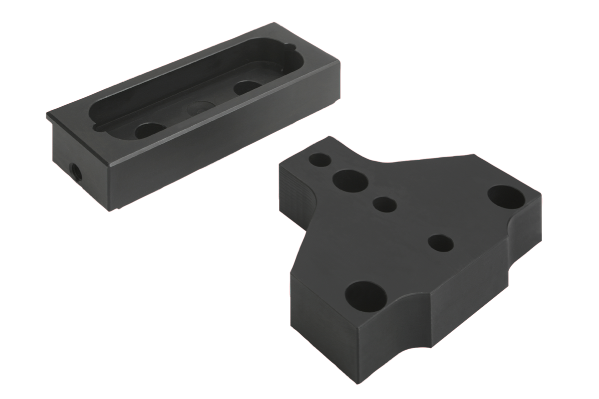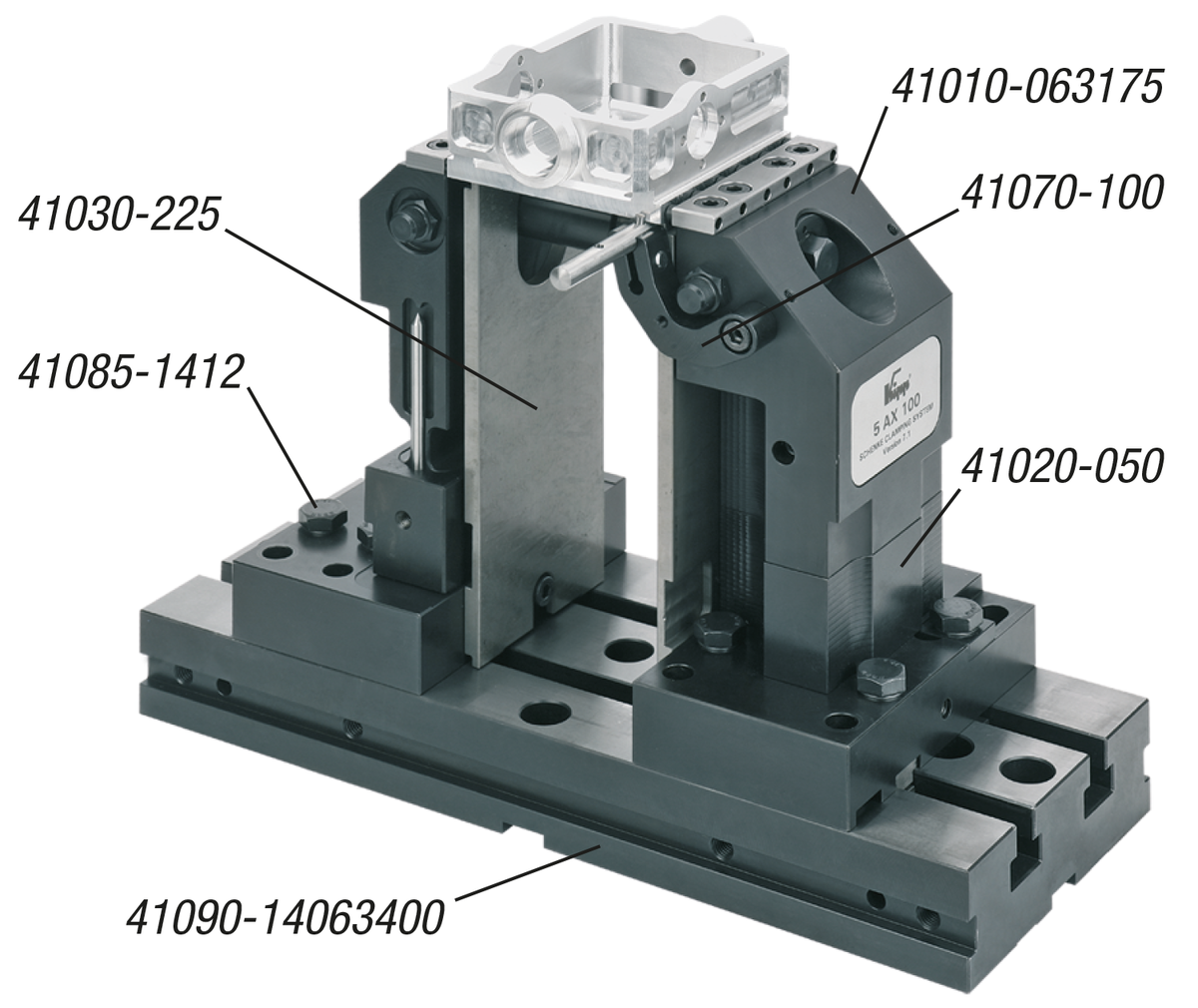 L’augmentation de la hauteur de l’étau se fait en intercalant les entretoises entre la base et le support de mors. La hauteur de l’étau de serrage 3 axes peut ainsi passer à 125 ou 150 mm et celle de l’étau 5 axes à 200, 225 ou 250 mm.