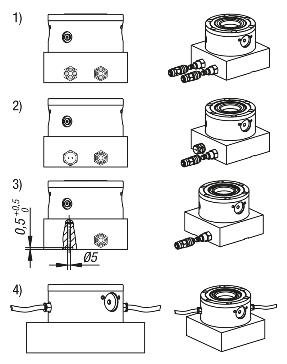 3) Dans le troisième cas, la chambre du piston doit être ventilée au moyen d'un perçage relié à la plaque de base par une rainure transversale. Le perçage doit toucher le raccord turbo pour que la ventilation soit possible.