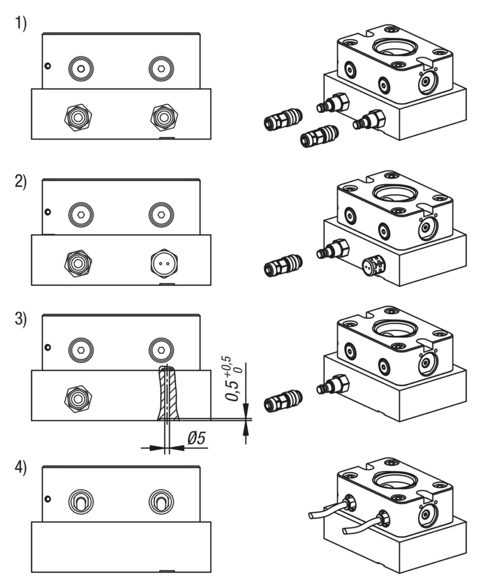 1) Raccordement et utilisation de la fonction turbo dans la plaque de base en plus du raccord « Ouvrir ». Le module de bridage peut ainsi être resserré par une brève impulsion d'air en cas de besoin. (Recommandé)