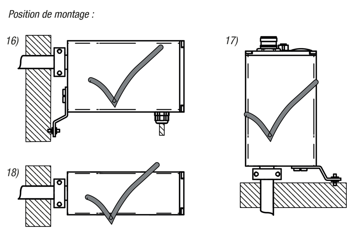 Les servomoteurs peuvent être montés avec le côté le plus étroit à l’horizontale ou à la verticale par rapport à l’arbre de la machine. Il est important que l’arbre entraîné (palier fixe) et le point de fixation du bras de couple (palier libre) soient alignés afin de réduire au maximum les contraintes mécaniques sur tous les composants. En cas de montage horizontal, les servomoteurs doivent être montés avec le côté le plus étroit vers le haut. Un montage en position transversale, c.-à-d. avec le côté large vers le haut, n’est possible qu’après une évaluation minutieuse des conditions de montage et l’autorisation du fabricant.