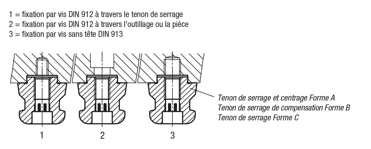 Les broches de serrage sont vissées à la pièce et sont adaptées aux différents modules de base.