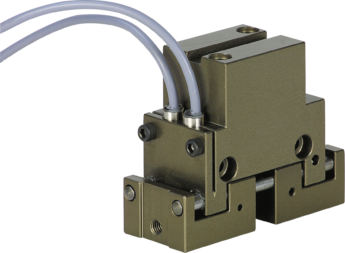 Pinces pneumatiques ne nécessitant aucun entretien et dotées d'un mécanisme à coulisse. Commande par un distributeur pneumatique à 4/2 ou 5/2 voies. L‘actionnement s‘effectue par de l‘air comprimé à 4-8 bars constant, filtré (10 µm), sec, huilé