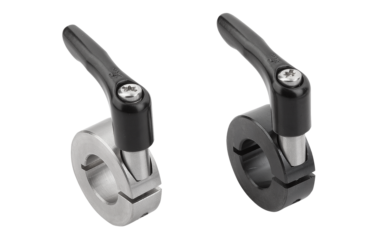 Les bagues d'arrêt fendues avec manette indexable enserrent l'arbre en assurant une répartition homogène des forces de serrage. Elles épousent ainsi parfaitement l'arbre et permettent des forces de serrage très élevées sans pour autant l'endommager.